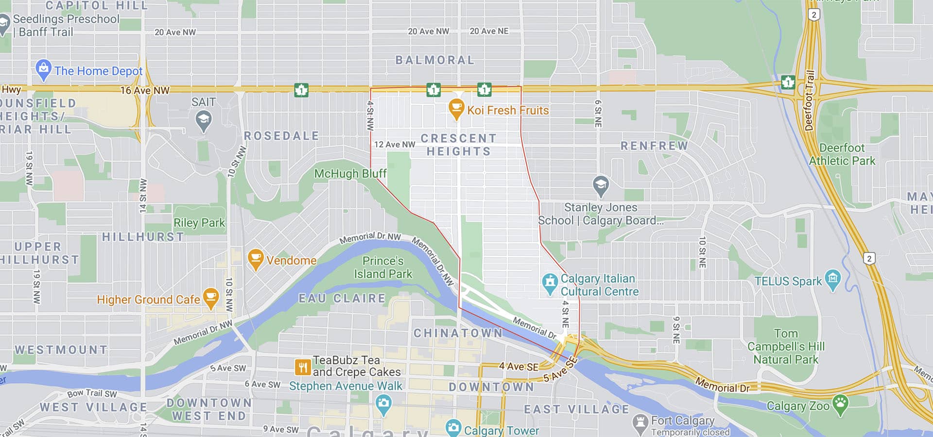 With a variety of properties ranging from detached bungalows, apartments, luxury homes and more, you're bound to find your next home in Crescent Heights. Located along the Bow River and immediately north from Downtown, Crescent Heights is bounded to the north by the Trans-Canada Highway, on the east by Edmonton Trail, on the west by 4th Street NW, and to the south by Memorial Drive.