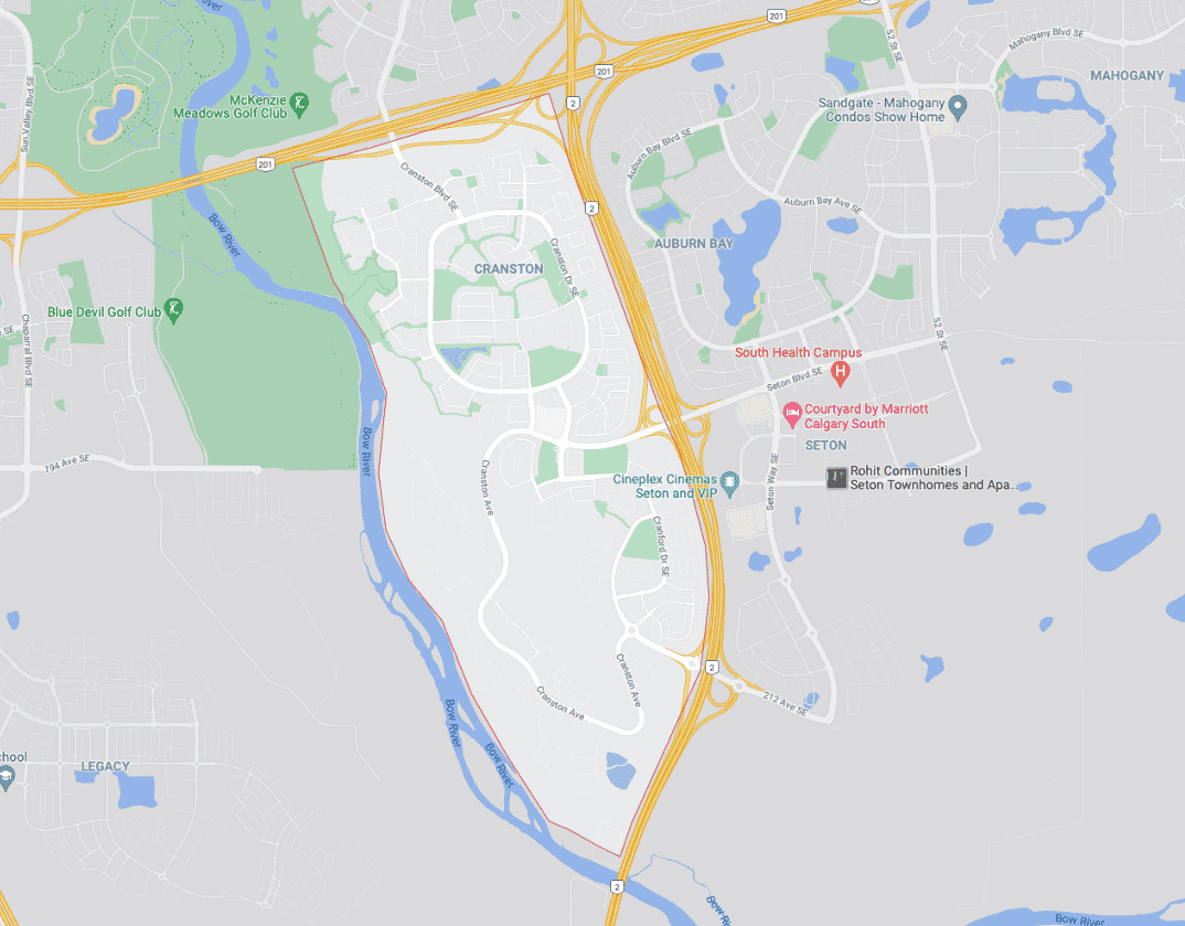 Located in the city's southeast quadrant, Stoney Trail bounds Cranston to the north and Fish Creek Park and the Bow River to the west and south and neighbours the communities of Seton, Auburn Bay, and Chaparral.